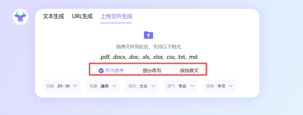 第二步:选择优化模式。上传后,AI会智能分析文档内容,并询问您:“需要优化文案内容还是保持原文?”这是一个关键选择点。